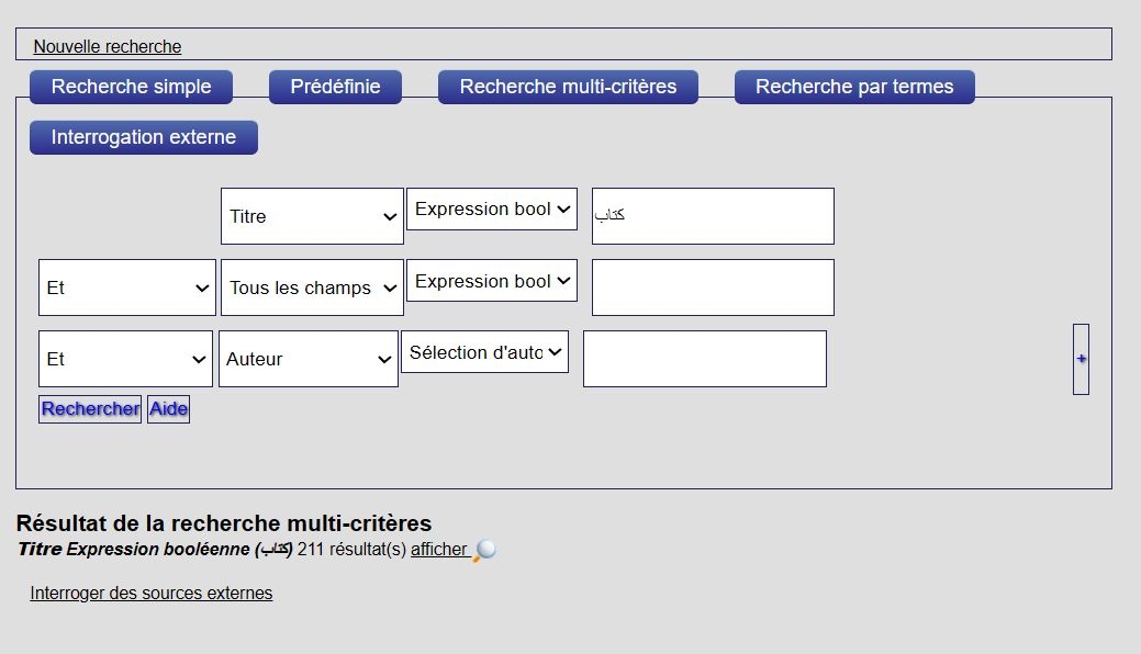 Lorsqu'une recherche est effectuée (par exemple sur le titre "كتاب"), le système affiche bien le nombre de résultats (ex: 211 résultats), mais dès que je clique sur le lien "afficher", une erreur SQL apparaît :