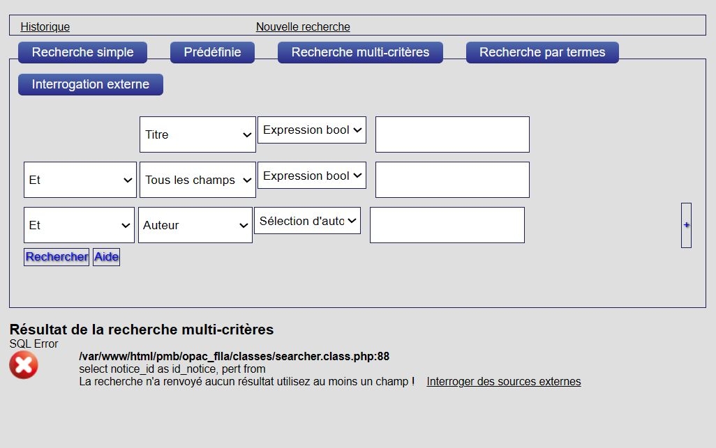 /var/www/html/pmb/opac_flla/classes/searcher.class.php:88select notice_id as id_notice, pert fromLa recherche n'a renvoyé aucun résultat utilisez au moins un champ !
