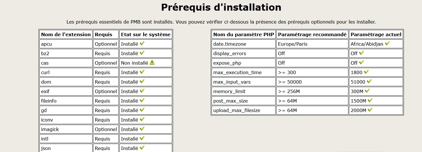 • C'est pareil avec les autres navigateurs. J'ai vérifié les infos du système du serveur, ainsi que les paramétres des prérequis de PMB. Voici les captures d'ecran